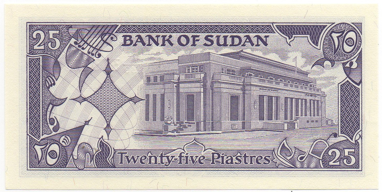 | Back Info | Color: Purple on multicolor underprint. Right: Bank of Sudan building - Khartoum Middle: Bank of Sudan building - Khartoum Left: |