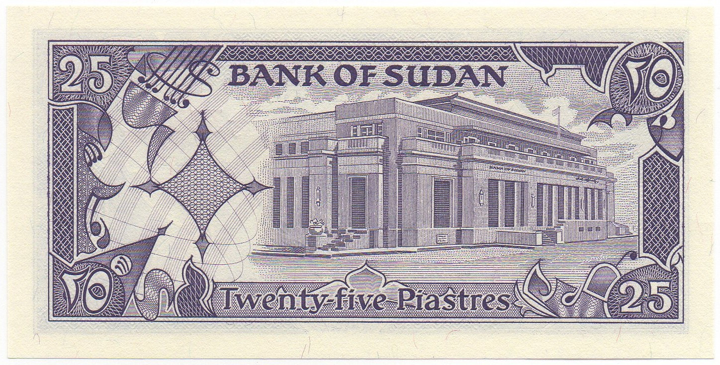 | Back Info | Color: Purple on multicolor underprint. Right: Bank of Sudan building - Khartoum Middle: Bank of Sudan building - Khartoum Left: |