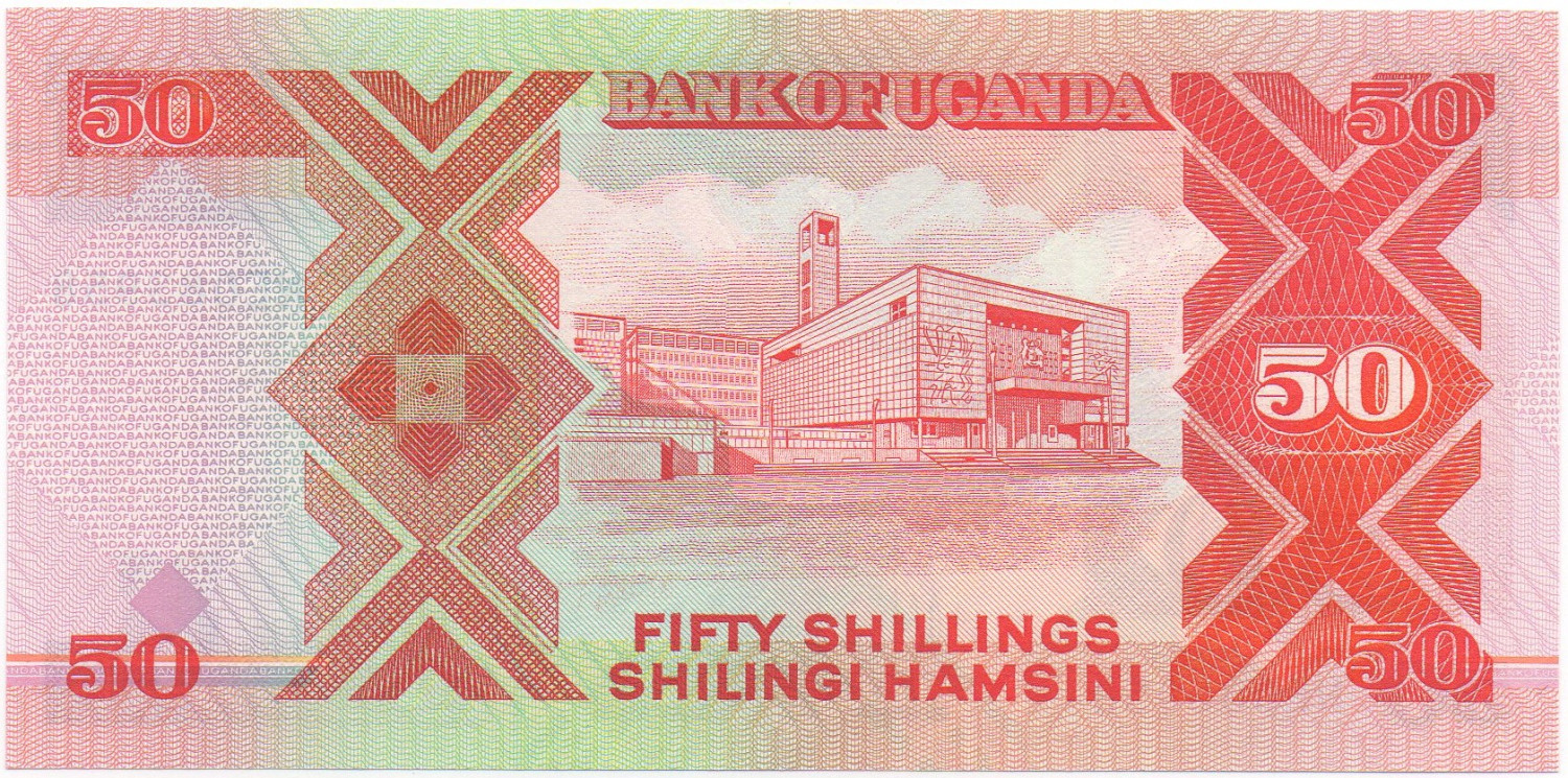 | Back Info | Color: Red, orange and dark brown on multicolor underprint. Right: Geometric forms. Middle: Parliament Building in Kampala Left: Geometric forms. |