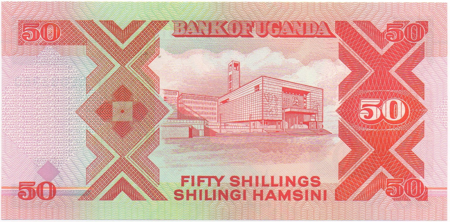 | Back Info | Color: Red, orange and dark brown on multicolor underprint. Right: Geometric forms. Middle: Parliament Building in Kampala Left: Geometric forms. |