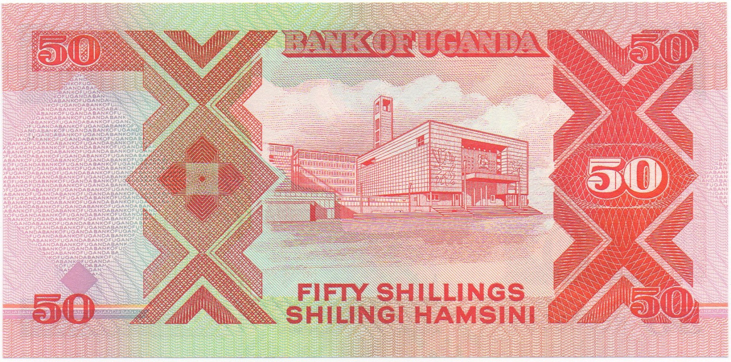 | Back Info | Color: Red, orange and dark brown on multicolor underprint. Right: Geometric forms. Middle: Parliament Building in Kampala Left: Geometric forms. |