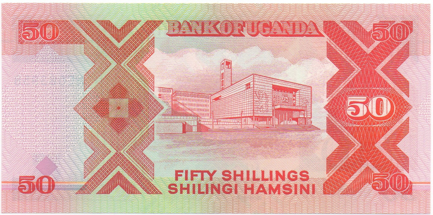 | Back Info | Color: Red, orange and dark brown on multicolor underprint. Right: Geometric forms. Middle: Parliament Building in Kampala Left: Geometric forms. |