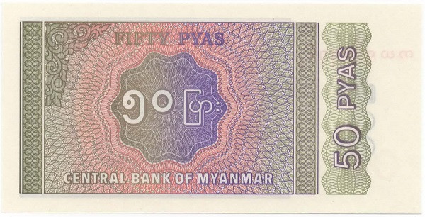 | Front Info | Color: Dull purple and dull brown on gray and tan underprint. Right: Geometric forms. Middle: Musical string instrument (Burmese harp) Left: Denomination & Unit |