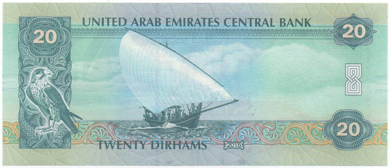 | Comments | Serial Number: Virtical in red at left , Horizontal in black at right. Watermark: Falcon's head , Horizontal lines for sight-impaired. Issuing Authority: United Arab Emirates Central Bank, 2009 - 2016 Issue (2015) New State arms Issue Banknote Size: 14.9 * 6.4 CM Banknote Printer: Other Remark: Replacement Prefix: 999 |