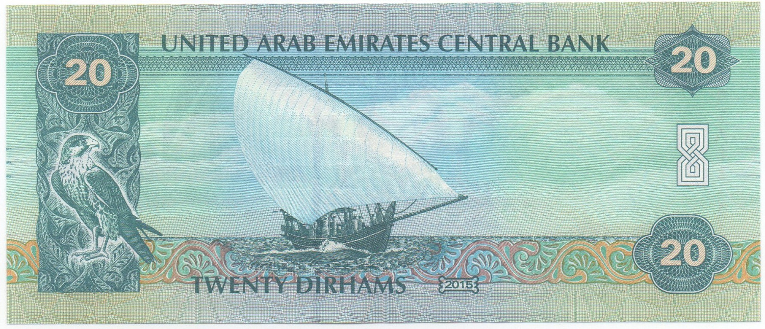 | Comments | Serial Number: Virtical in red at left , Horizontal in black at right. Watermark: Falcon's head , Horizontal lines for sight-impaired. Issuing Authority: United Arab Emirates Central Bank, 2009 - 2016 Issue (2015) New State arms Issue Banknote Size: 14.9 * 6.4 CM Banknote Printer: Other Remark: Replacement Prefix: 999 |