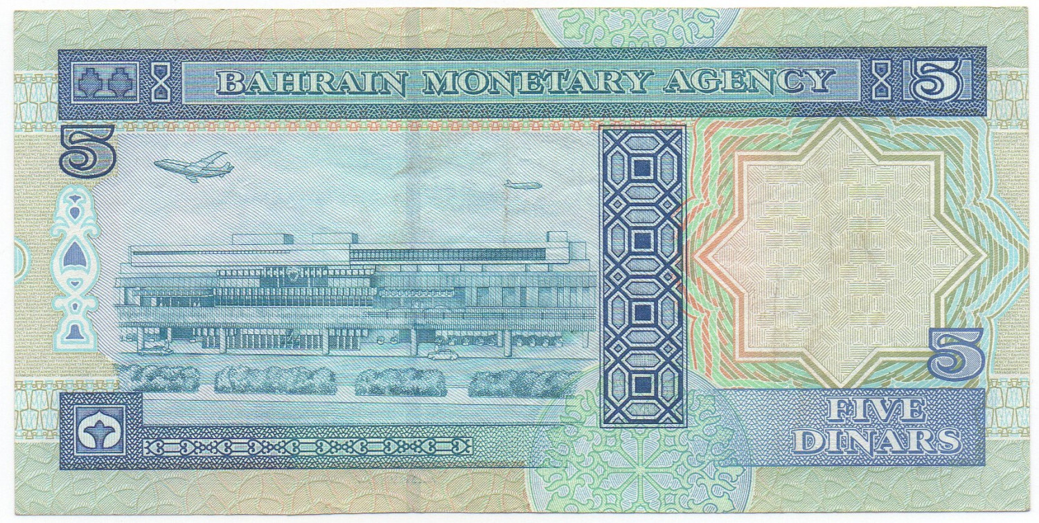 | Back Info | Color: Blue on multicolored underprint. Right: Denomination & Unit in English Language, Geometric forms. Middle: Bahrain International Airport Left: Bahrain International Airport |