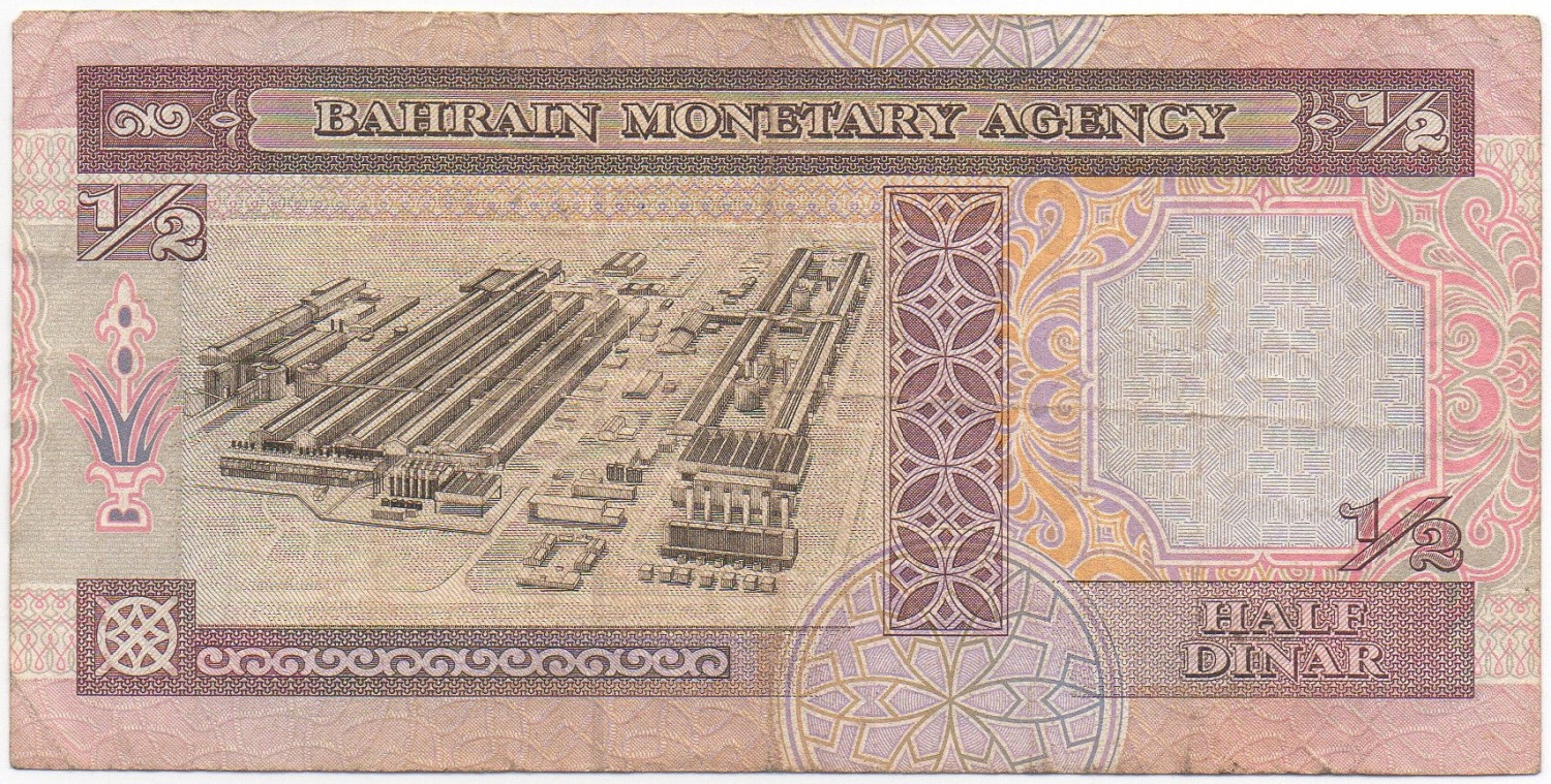 | Back Info | Color: Deep brown, violet, and black. Right: Denomination & Unit in English Language Middle: Geometric forms. Left: Aluminum Bahrain facility. |