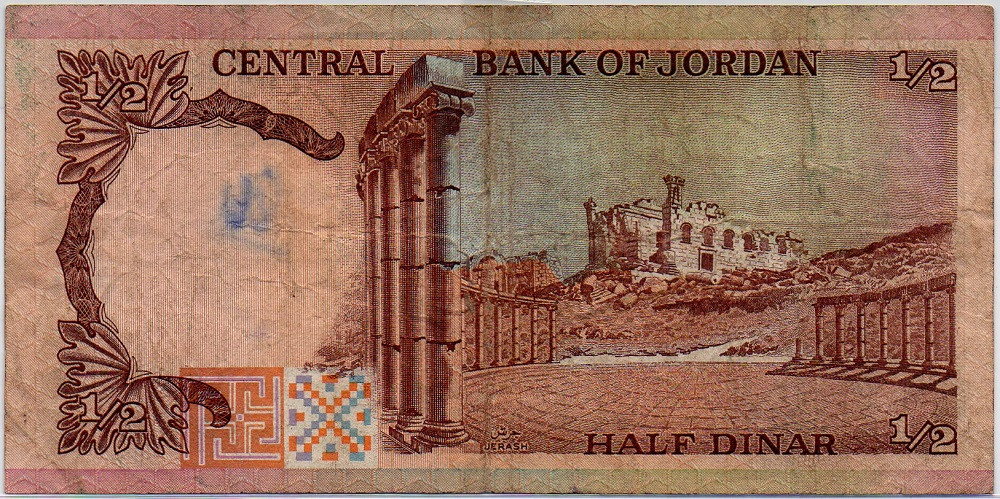 | Front Info | Color: Brown on multicolored underprint. Right: Middle: Denomination & Unit in Arabic Language Left: King Hussein |