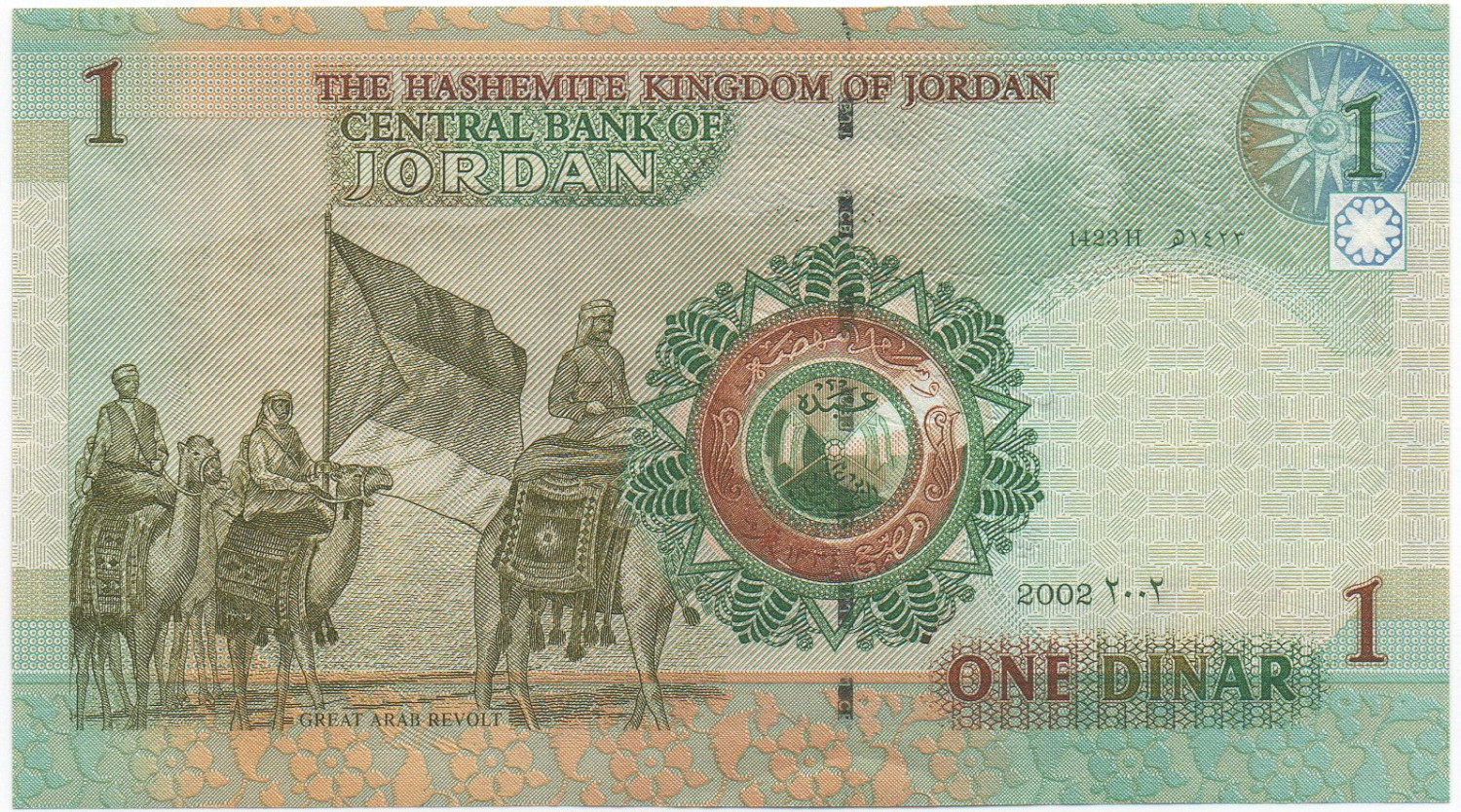 | Back Info | Color: Green, gold, and brown on multicolored underprint. Right: Middle: Great Arab Revolt scene. Left: Great Arab Revolt scene. |