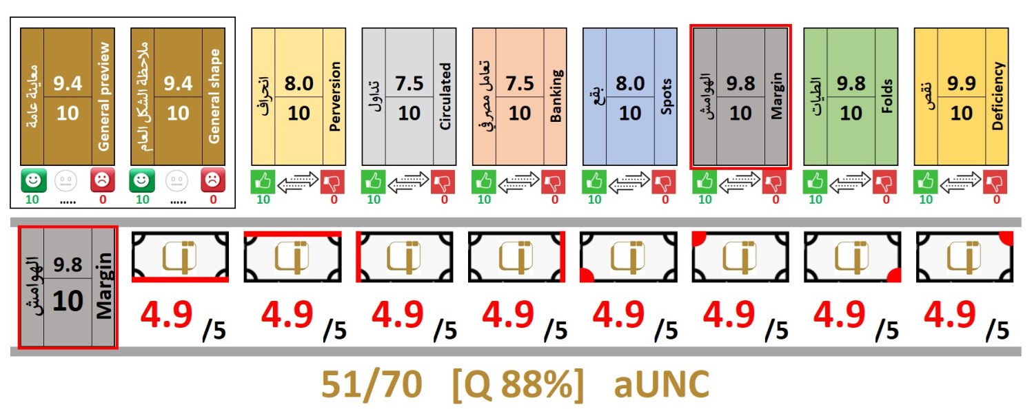 | Front Info | Color: Brownish-red on multicolored underprint. Right: Arms. Middle: Denomination & Unit in Arabic Language. Left: Dhow. |