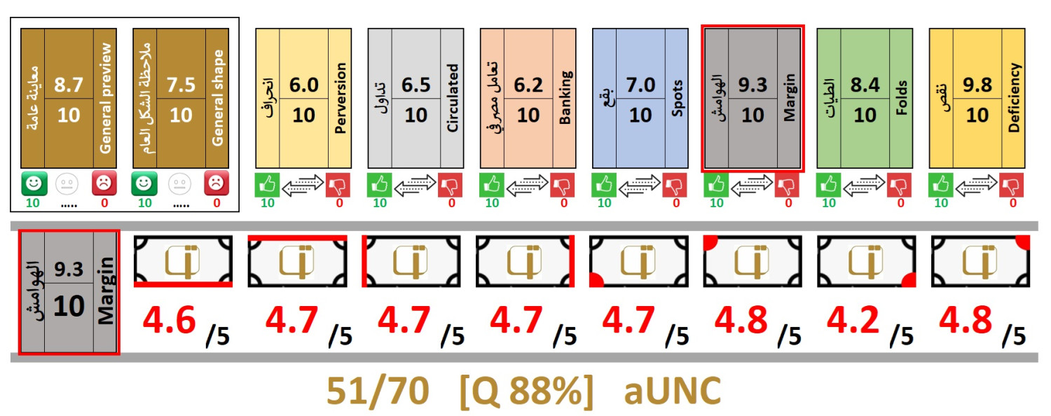 | Front Info | Color: Brown on multicolored underprint. Right: Arms Middle: Denomination & Unit in Arabic Language Left: |