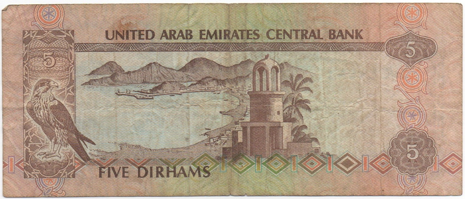 | Back Info | Color: Brown and orange on multicolored underprint. Right: Middle: Coastal bay with Salem Al Mutawa Mosque in Khorfakkan. Left: Sparrowhawk |