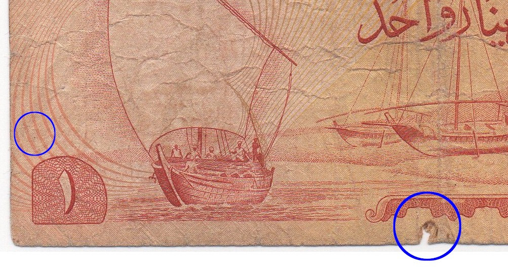 | Front Info | Color: Brownish-red on multicolored underprint. Right: Arms. Middle: Denomination & Unit in Arabic Language. Left: Dhow. |