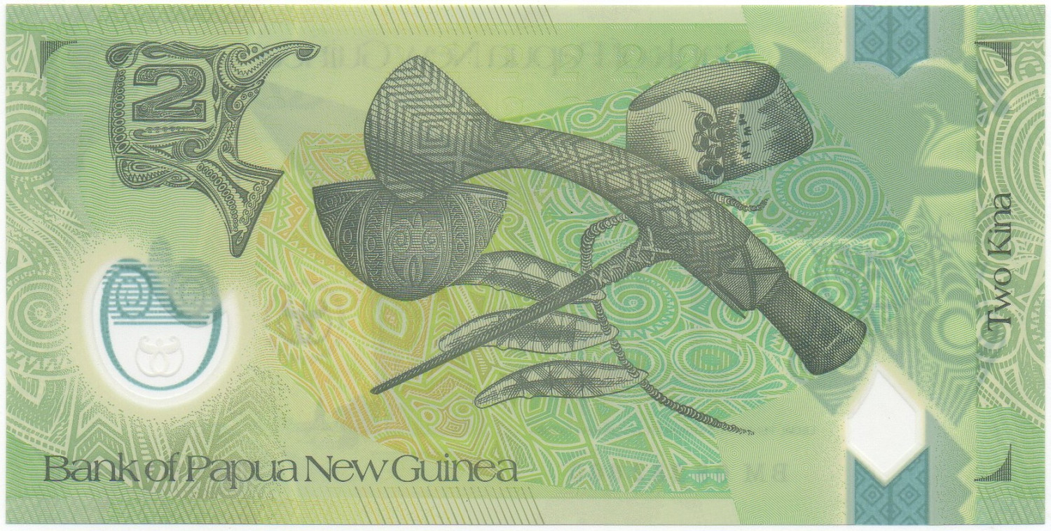 | Back Info | Color: Green on multicolored underprint. Right: Denomination & Unit in English Language Middle: Artifacts shows a Mount Hagen axe among other things Left: |