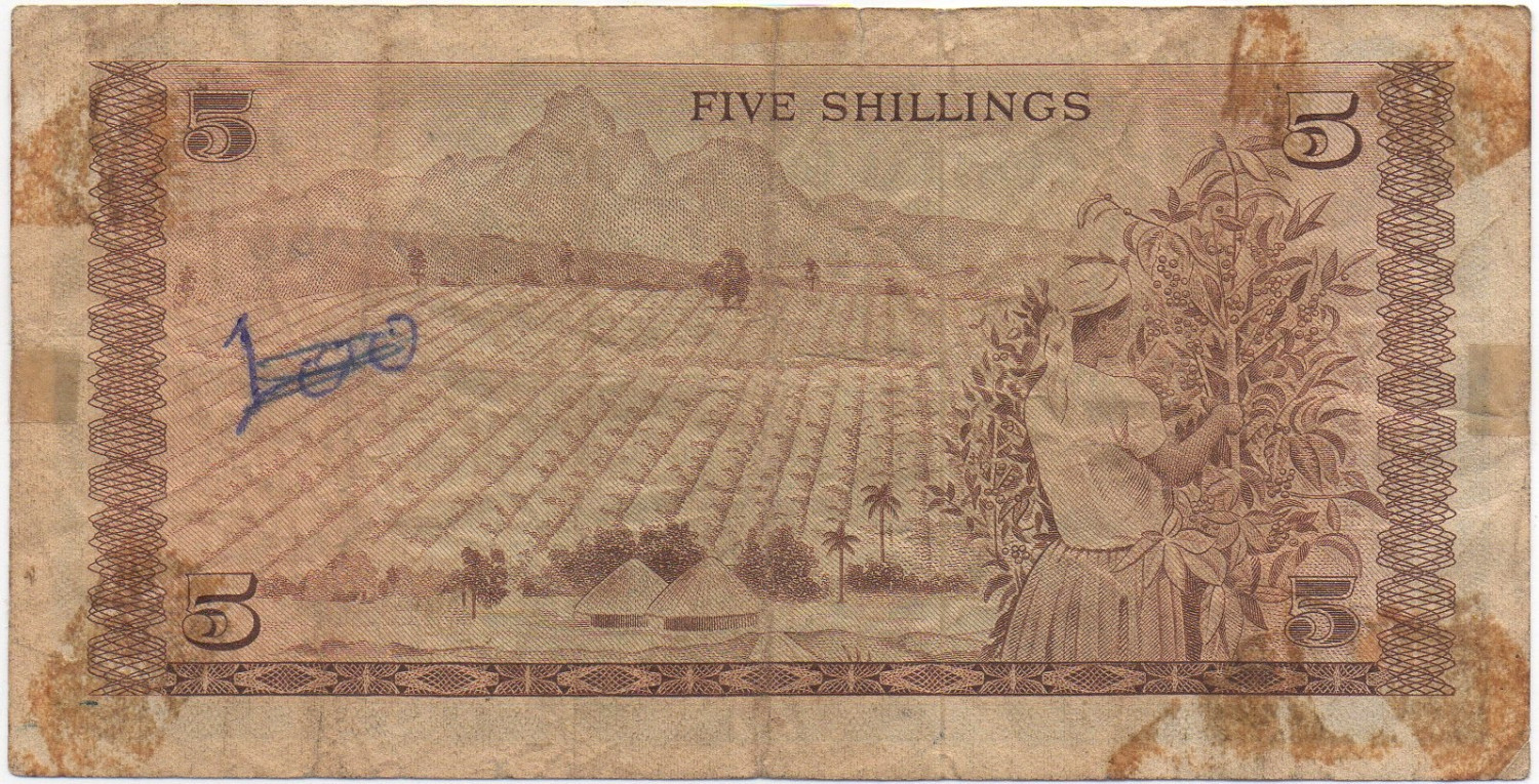 | Front Info | Color: Brown on multicolored underprint. Right: Middle: Arms Left: Mzee Jomo Kenyatta |