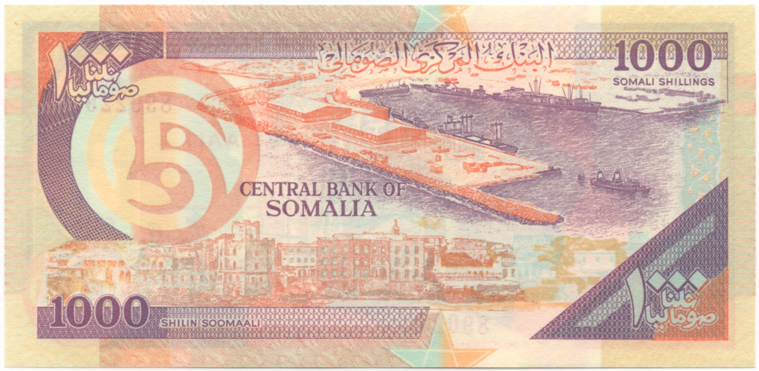 | Back Info | Color: Purple and orange on multicolor underprint. Right: City view at bottom, Port of Mogadishu Middle: City view at bottom, Port of Mogadishu Left: City view at bottom, Port of Mogadishu |