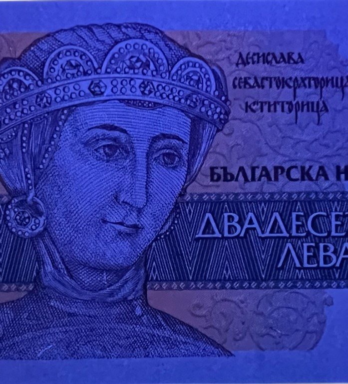| Front Info | Color: Blue-black and blue-green on multicolored underprint. Right: Denomination & Unit Middle: A portrait of sebastocratorina Desislava, a founder of Boyana Church; a fresco fragment. Left: A portrait of sebastocratorina Desislava, a founder of Boyana Church; a fresco fragment. |