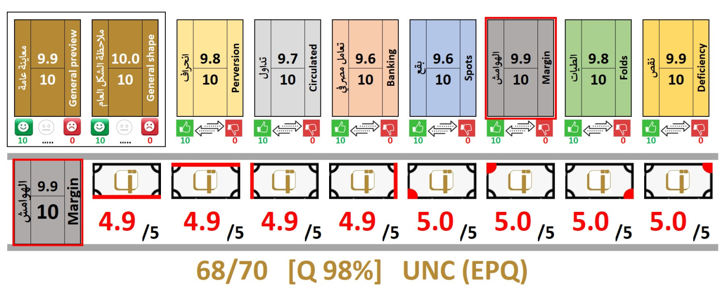 | Comments | Serial Number: Horizontal , Black at right and red at left. Watermark: Falco's head , With mark for the blind at left on front. Issuing Authority: Qatar Central Bank , ND (2008) Issue Banknote Size: 13.4 * 6.6 CM Banknote Printer: Thomas De La Rue & Company, Limited (England) - TDLR Other Remark: Tactile markings for visually impaired people added at center left edge. |