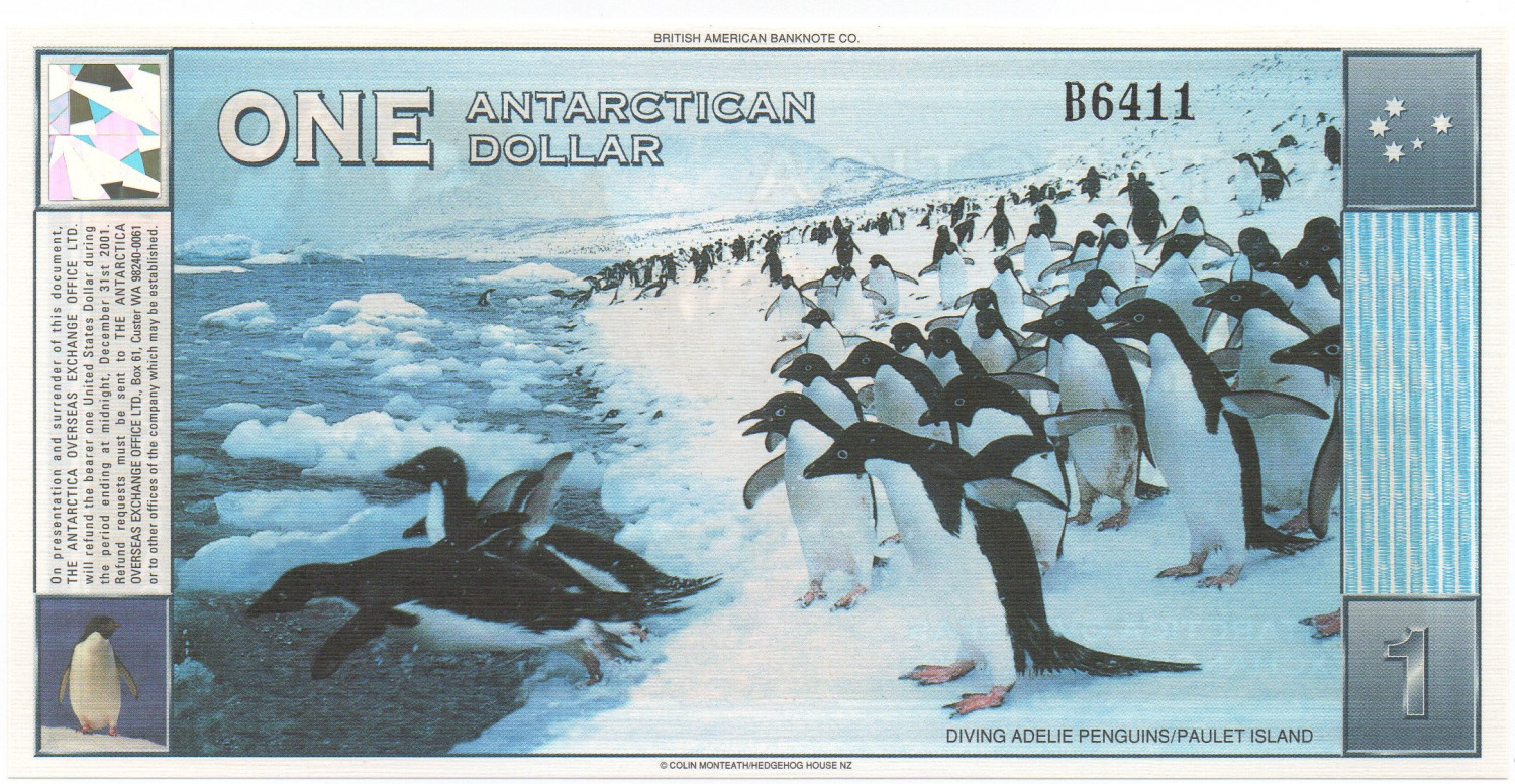 | Comments | Serial Number: Horizontal , Black color. Watermark: Issuing Authority: Antarctica Overseas Exchange Office Banknote Size: 17.78 * 8.89 CM Banknote Printer: British American Banknotes Co. Other Remark: Commemorative issue |